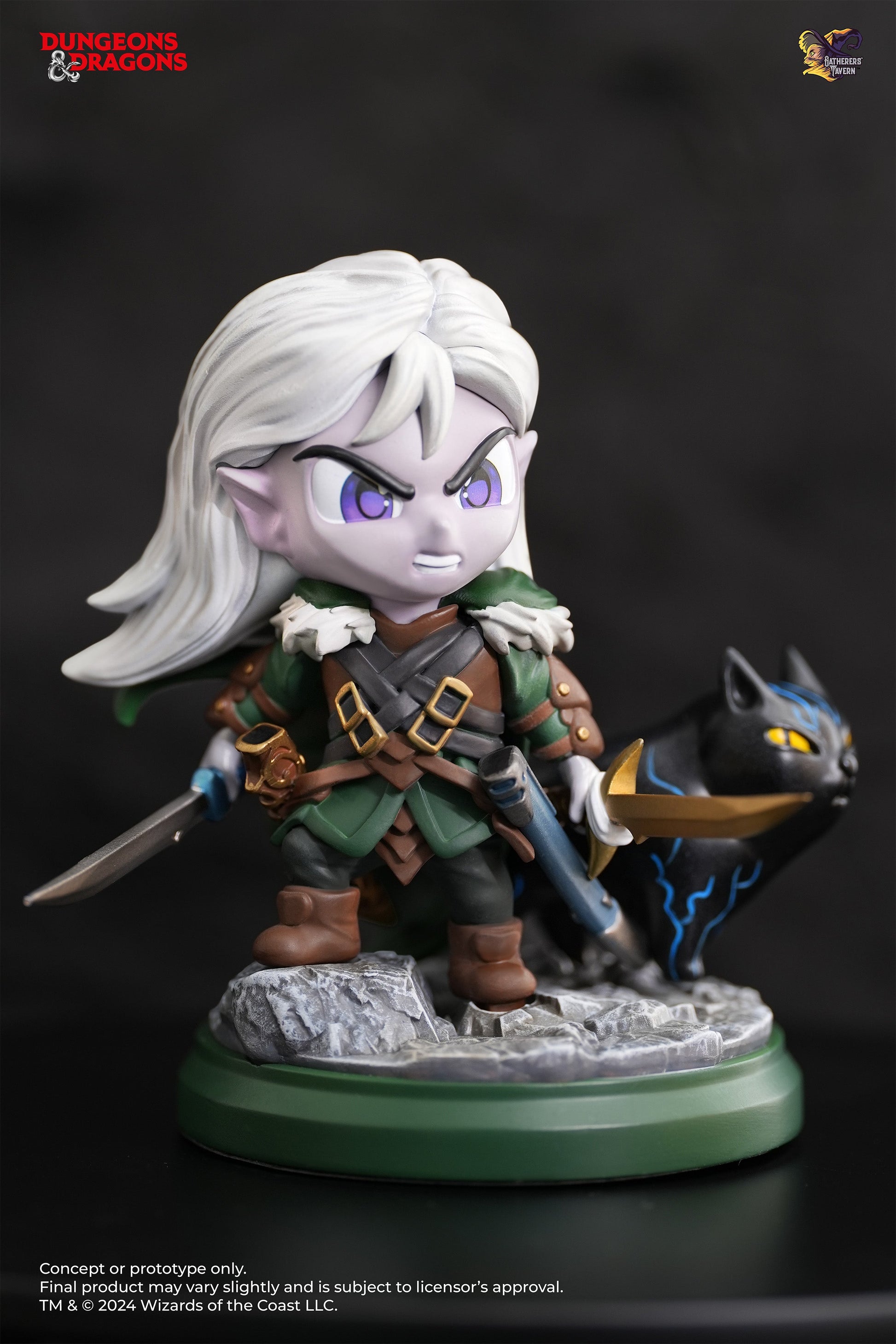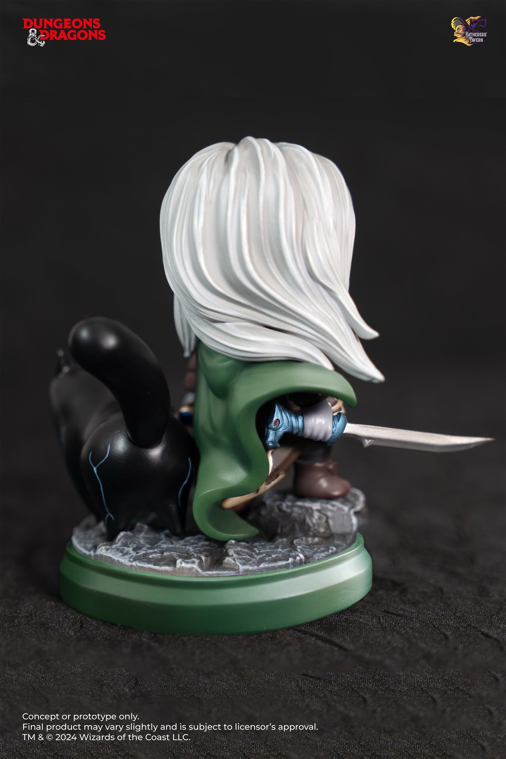 This adorable 4-inch figurine showcases the legendary drow ranger, Drizzt Do'Urden, and his fierce panther companion, Guenhwyvar, in a fun and charming style. Drizzt is depicted confidently wielding his dual scimitars, while Guenhwyvar is ready to pounce, bringing a playful touch to any collection.